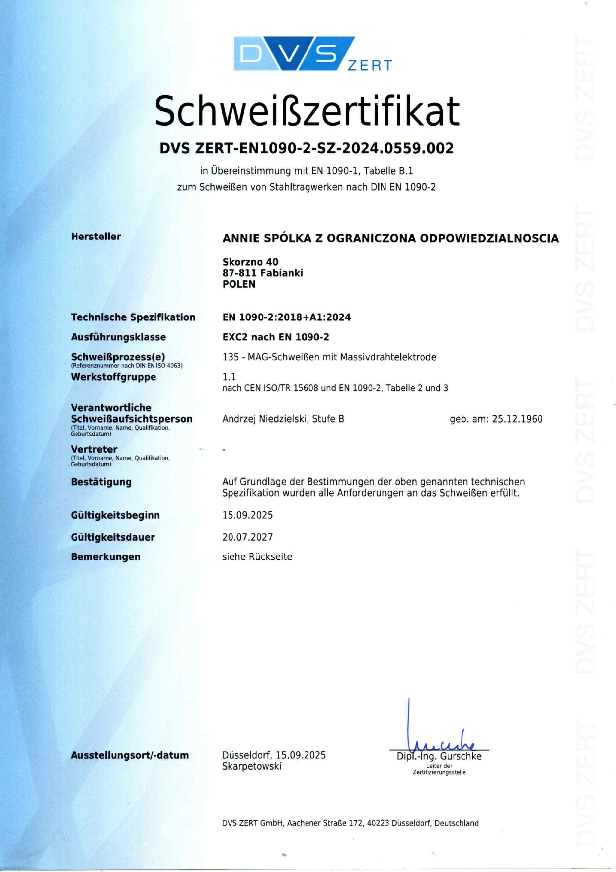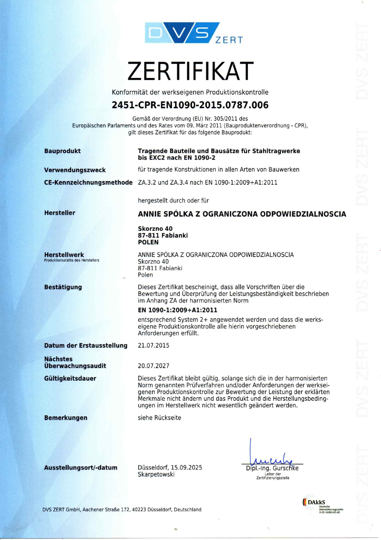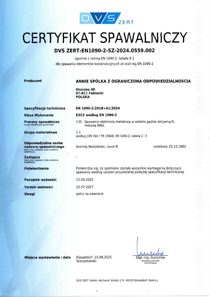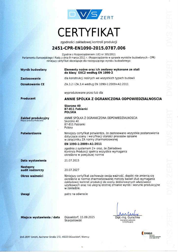 Dzięki wysokiej jakości naszych usług od 2015r posiadamy uprawnienia certyfikowane przez niemiecką firmę DVS Zert na produkcję i montaż elementów konstrukcji stalowych oraz całych hal stalowych wg EN 1090-2, uprawniające nas do wykonywania konstrukcji i montażu hal na terenie całej Unii Europejskiej.